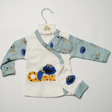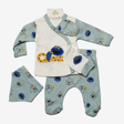 Комплект ясельний для новонароджених складається з п'яти елементів: кофта-сорочечка, повзуни, нагрудник, нецарапки, шапочка.